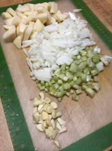 Dice the potato, onion, and celery and mince the garlic. Peel, seed, and dice the squash.
