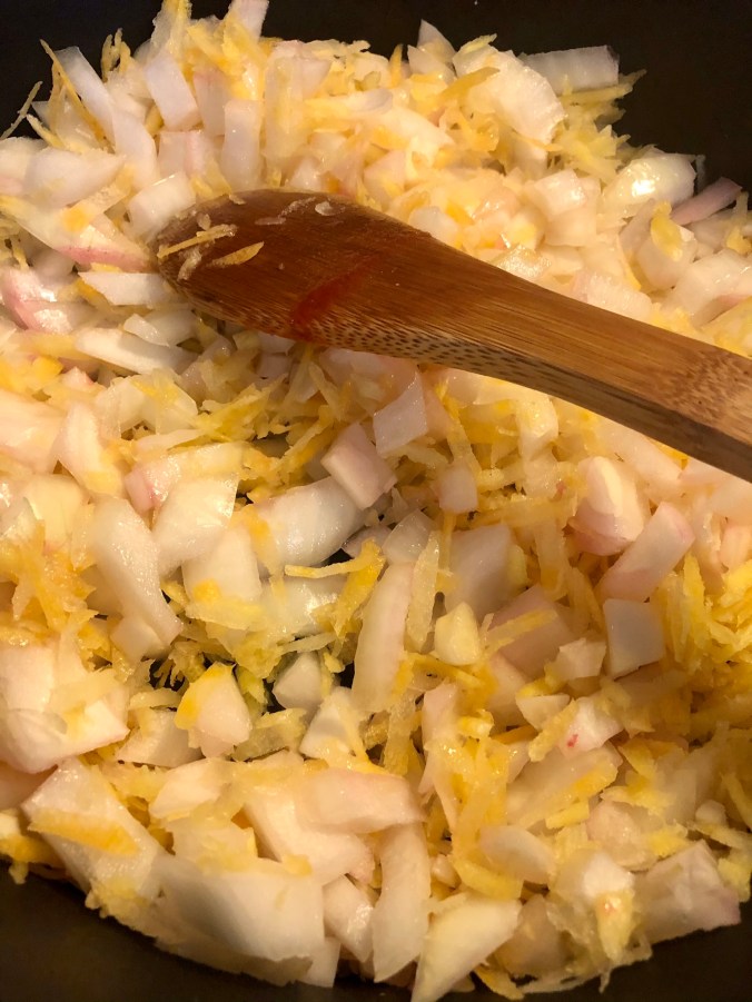 Shred the carrot and dice the onion and mince the garlic.