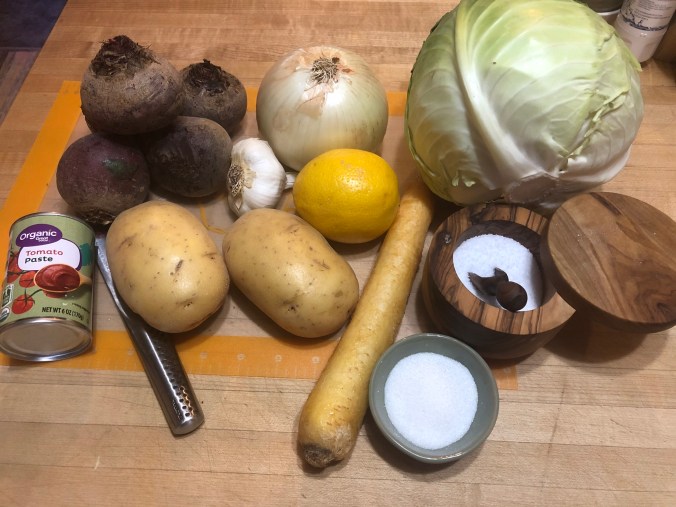 A few days ago we got the little glossy magazine that our electric company sends out each month. The magazine always includes some recipes that people have submitted. This issue was all soup recipes, and one of them was for Ukrainian Borscht. My husband frequently mentions that he enjoyed borscht growing up. This is new to my wheel house, but I love beets and all of the other ingredients in the soup so I decided to try it. I found a recipe in one of my Jewish cookbooks, googled more recipes, and finally came up with a meld of several recipes including the borscht in our electric company magazine. I called my sister-in-law to see if she remembered how my mother-in-law made hers, but she said, at the time, she didn’t take an interest in the cooking. I think we all wish we had taken more interest and made notes on how our mothers and grandmothers prepared some of our favorite dishes. Borscht is a sour soup common to Eastern Europe and Northern Asia. It is often liked to Jews, the group that first brought it to this country from Europe. Borscht comes directly from Yiddish as the dish was first popularized here by Yiddish speaking Ashkenazi Jews. I don’t find mine to be very sour so I did a little research to see where the “sour” comes from in the references. Apparently the tart taste is traditionally obtained by adding beet sour to the soup. And beet sour is made by covering sliced beets with lukewarm preboiled water and allowing bacteria to ferment some of the sugars. The liquid becomes viscous. This process takes 2-5 days. The liquid is then strained and added to the soup near the end of the cooking time so as to not let the sour dissipate. No beet sour in my soup, and my mother-in-law probably did not use it either. Instead I added the juice of one lemon.