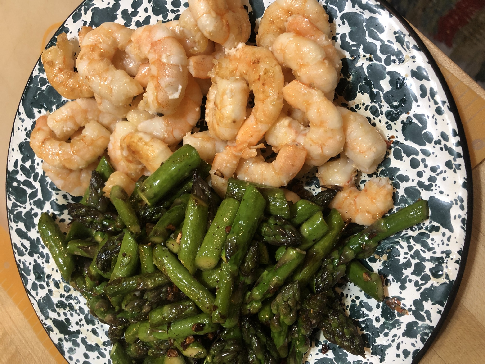 Once the asparagus has cooked remove it from the pan. Set aside along with the grilled shrimp.