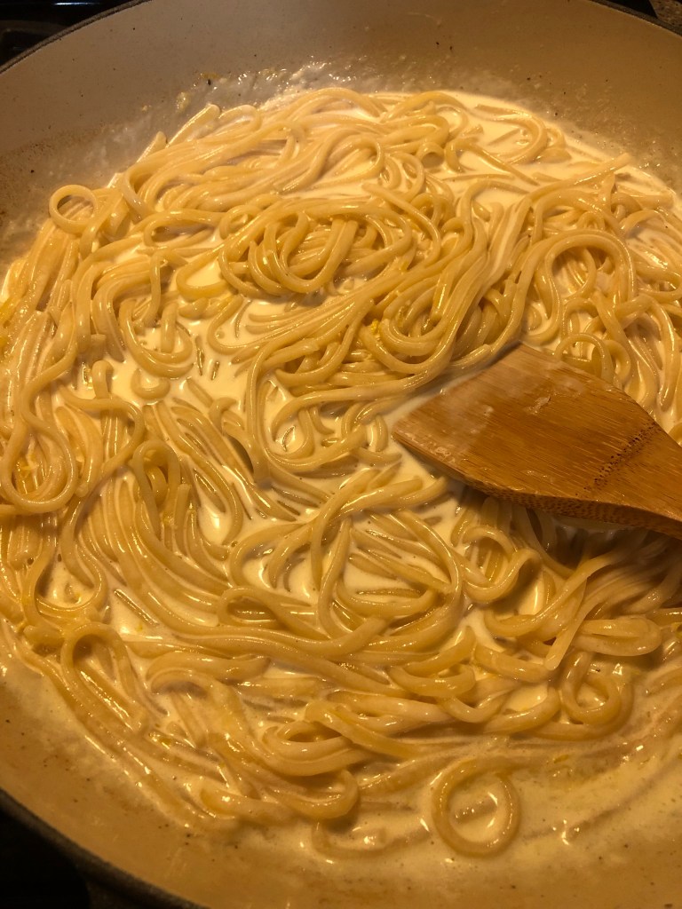 Once the cream has thickened add the pasta directly from the pot (do not drain) into the cream. Add additional pasta water until you have the desired sauce consistency.