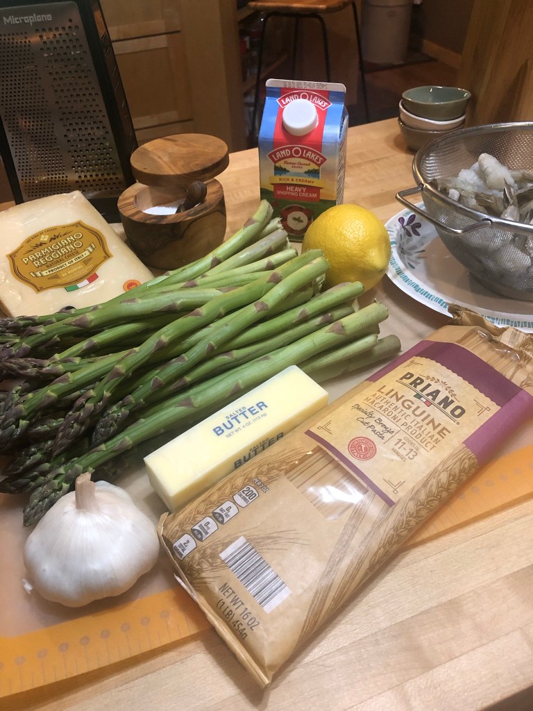 Fill a large pot with water that has been generously salted and cook your pasta according to package instructions. The original recipe called for fettuccine but I substituted linguine based on what was available in my pantry. While the pasta is cooking chop your asparagus into bite size pieces and mince the garlic.