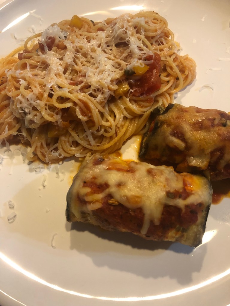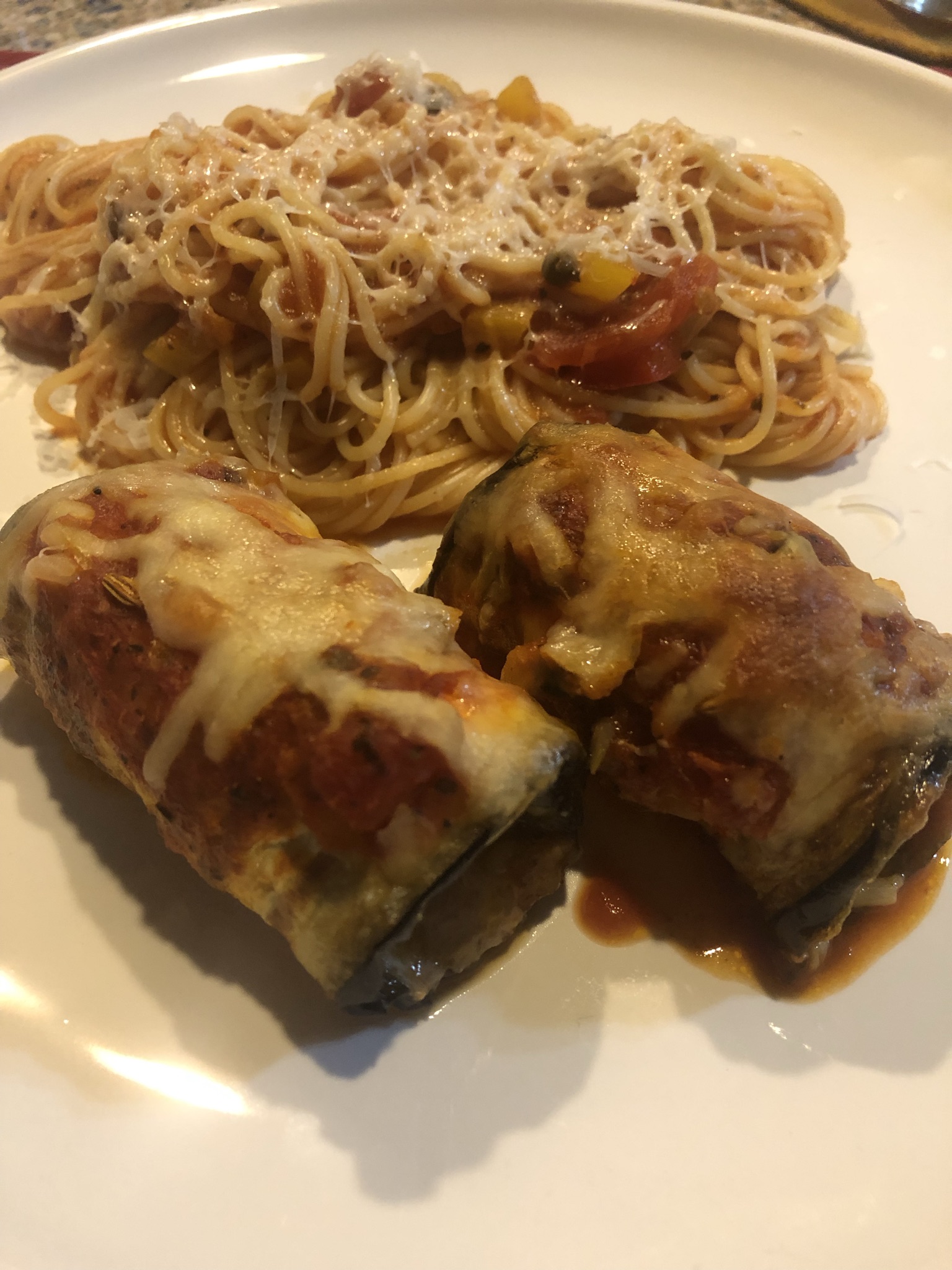 If you google eggplant recipes you will find an infinite number of ways to prepare it. It’s great grilled, baked, fried, or roasted. It can be served as an appetizer, a side dish, an entree, or you can use it in place of pasta in a lasagna. Raw, the flesh is spongy and soft, and when it’s cooked it is deliciously creamy and tender. Several years ago, before it closed, I regularly shopped at a gourmet shop called Blackberry Rose. The owner told me how to prepare eggplant rollups stuffed with angel hair pasta tossed in a light tomato sauce and then topped with a sweet chili sauce before baking. I need to try that again sometime soon. It was delicious! These rollups are stuffed with ground beef, ground pork, or sausage, and then baked much like eggplant Parmesan.