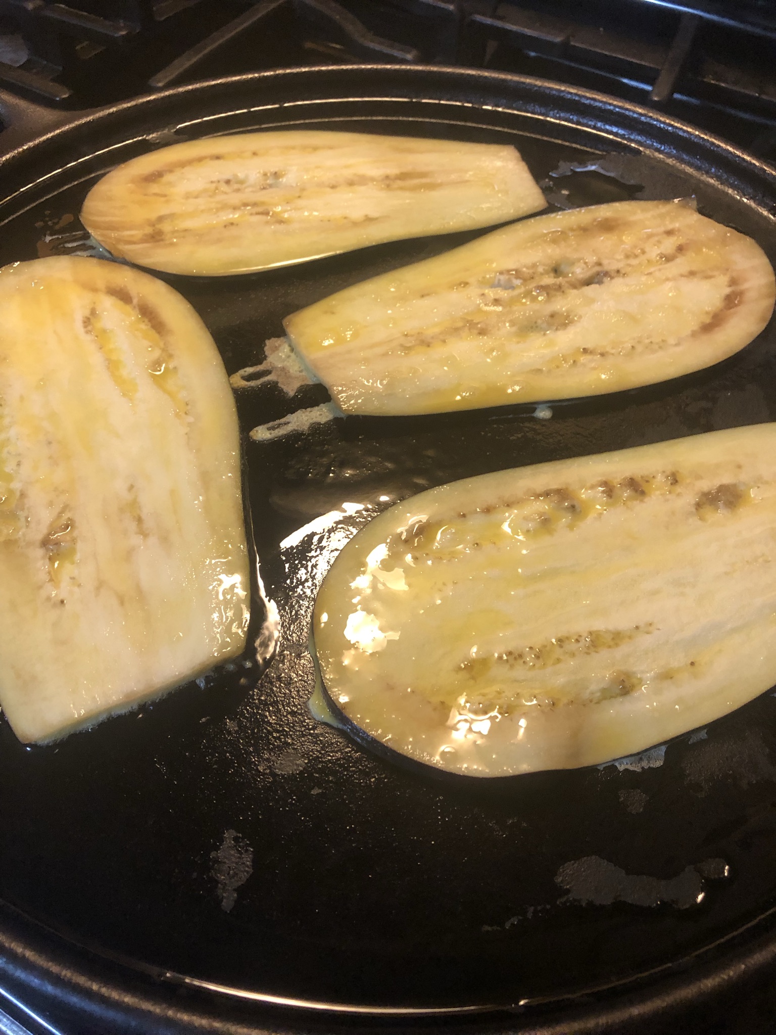 Once the eggplant has drained, rinse it and pat it dry. Whisk the eggs. Brush a heavy skillet with a light coating of olive oil. Dip the eggplant slices in the egg and cook them over medium high heat, two to thee minutes per side. Set the cooked slices aside and continue until all of the slices are browned. They should be soft and pliable, easy to roll.