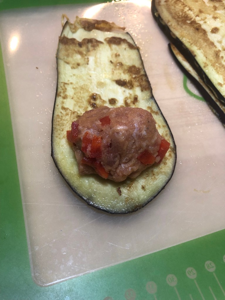 From one medium eggplant I got 13 slices and I used one pound of sausage to fill them.