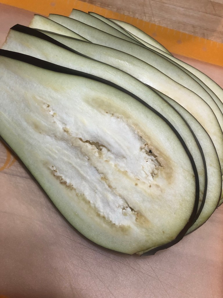 Making lengthwise cuts, use a mandolin to get nice thin slices of the eggplant.