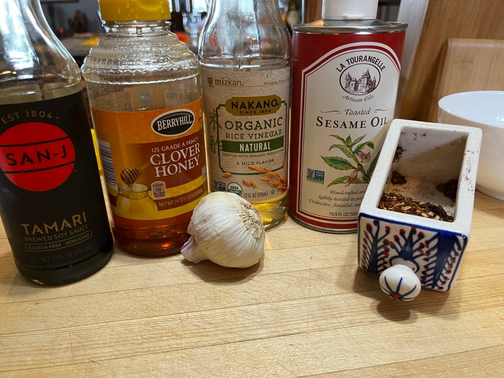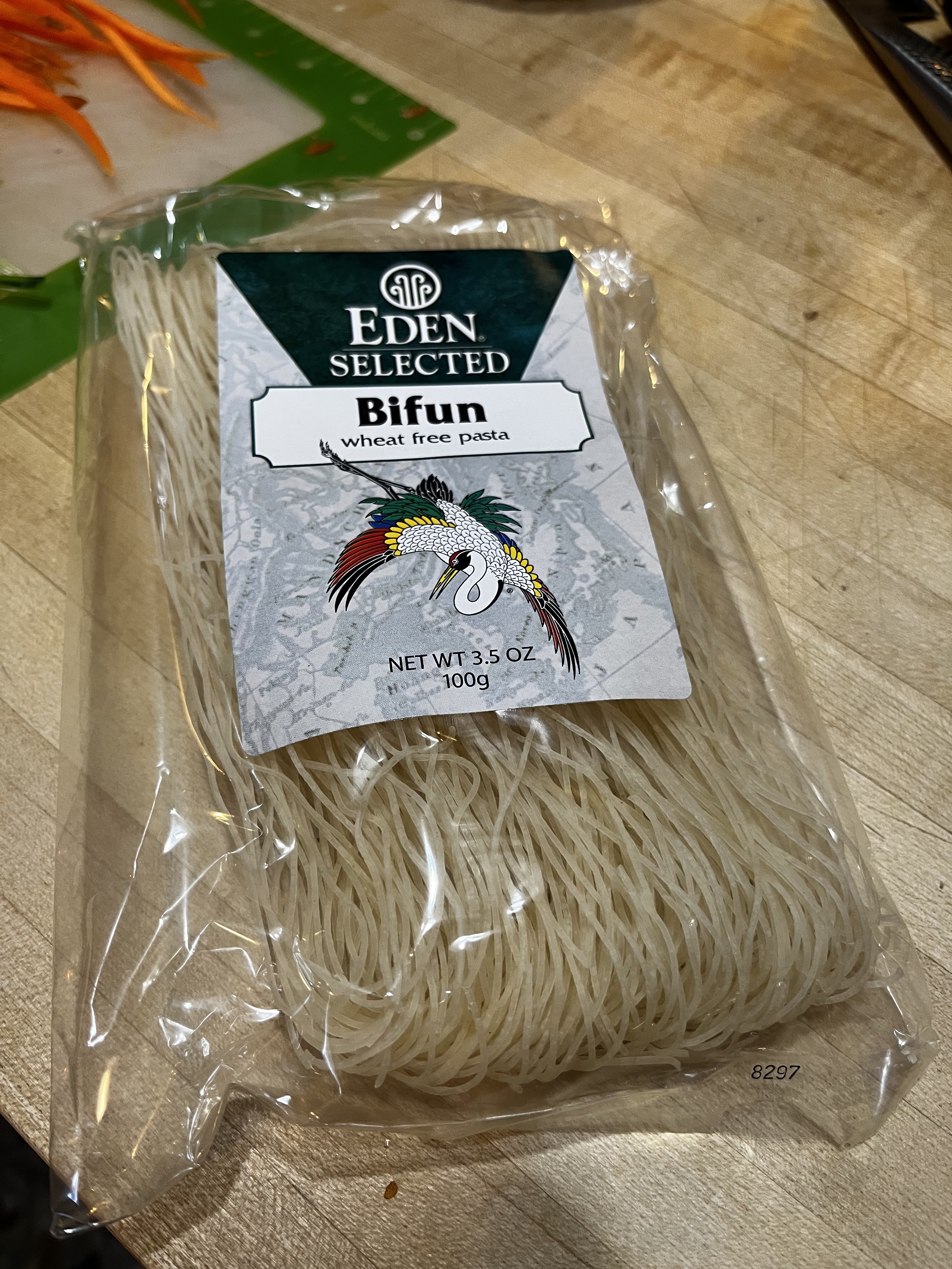 I used 2 to 3 oz of Bifun. Most of the recipes I found called for rice vermicelli, but this is what I had. Prepare the noodles according to the directions on the package. Once they are cooked shock them in ice water to stop the cooking, drain, and return to the pan. Toss with one or two tsp of toasted sesame oil and set aside.