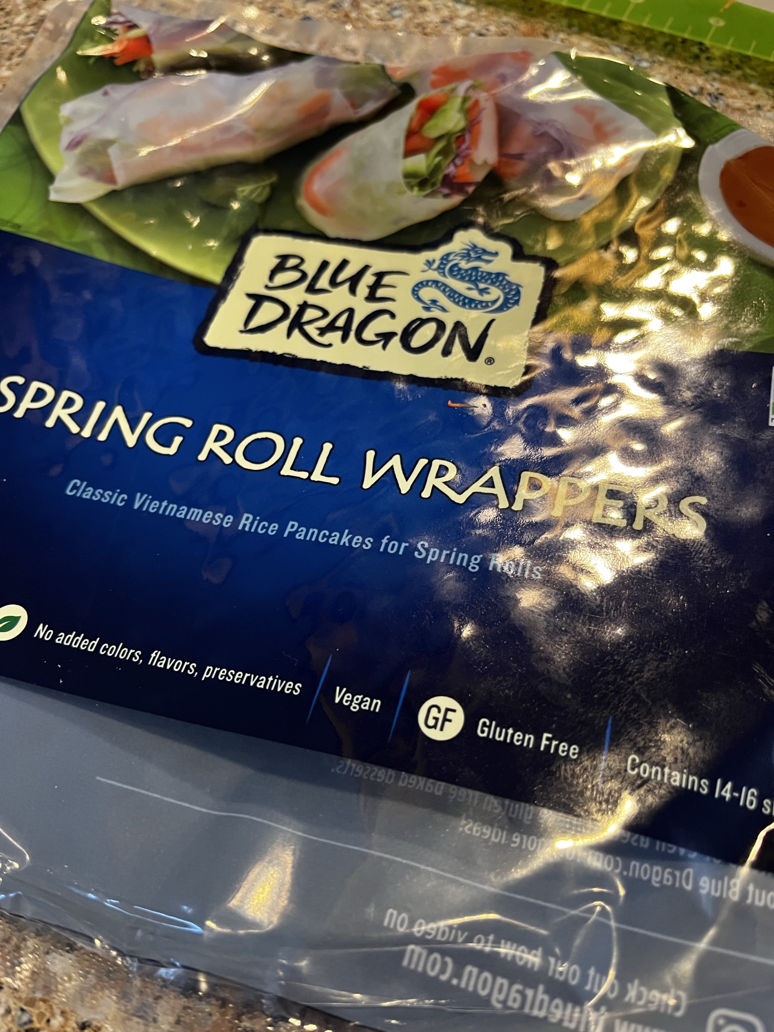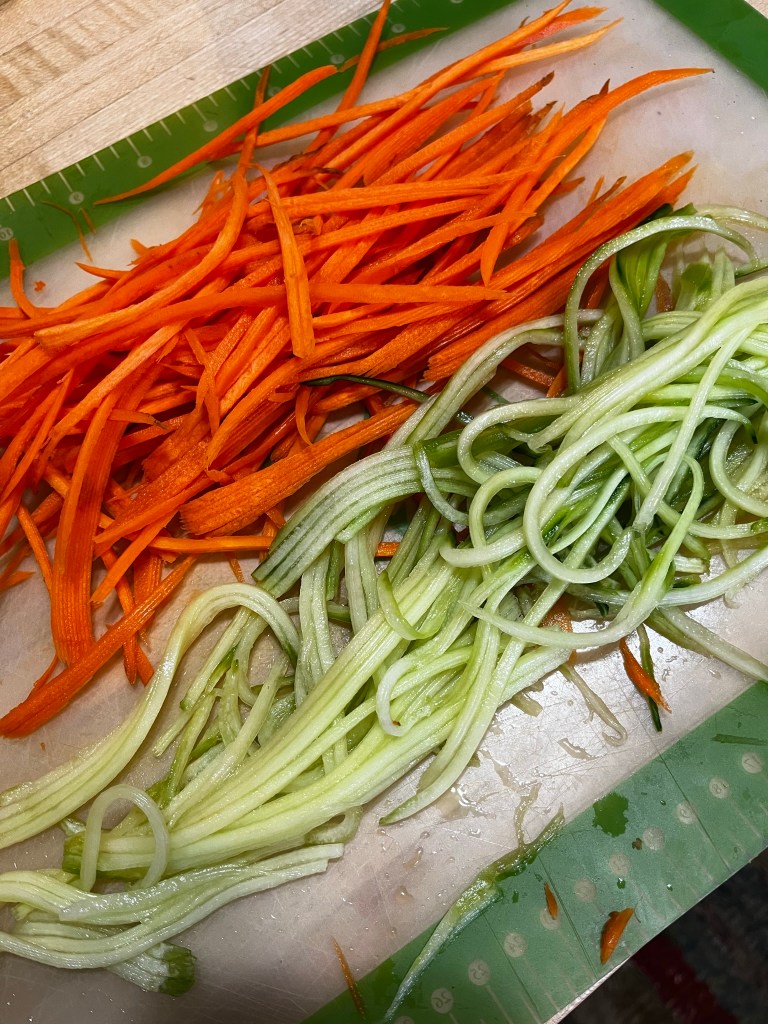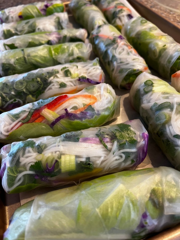 Spring Rolls were this weeks foodie project. I like to try new things to keep work in the kitchen interesting, and I’d never attempted spring rolls until now. There are a large variety of appetizers referred to as spring rolls. Wrappers differ as do fillings and cooking techniques. The spring rolls I made were filled with raw vegetables, a little mango, rice noodles, and herbs. They were wrapped in rice paper, and were not cooked. They were served at room temperature with dipping sauce. Ingredients and preparation vary from one Asian culture to another. After a little research, the preparation I used seems to me to most closely resemble Vietnamese salad rolls known as goi cuon. They can also be made to include cooked pork or shrimp. While these are not difficult at all to make the preparation is a bit fussy and tedious. All of the veggies need to be match sticked and that takes patience and a good sharp knife. Apparently you can buy the vegetables already prepared, but where is the fun in that?? You can easily personalize these and fill with ingredients of your choosing. This is what I used.