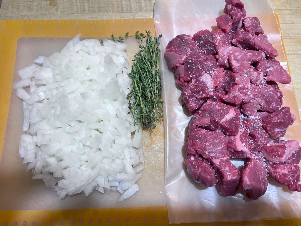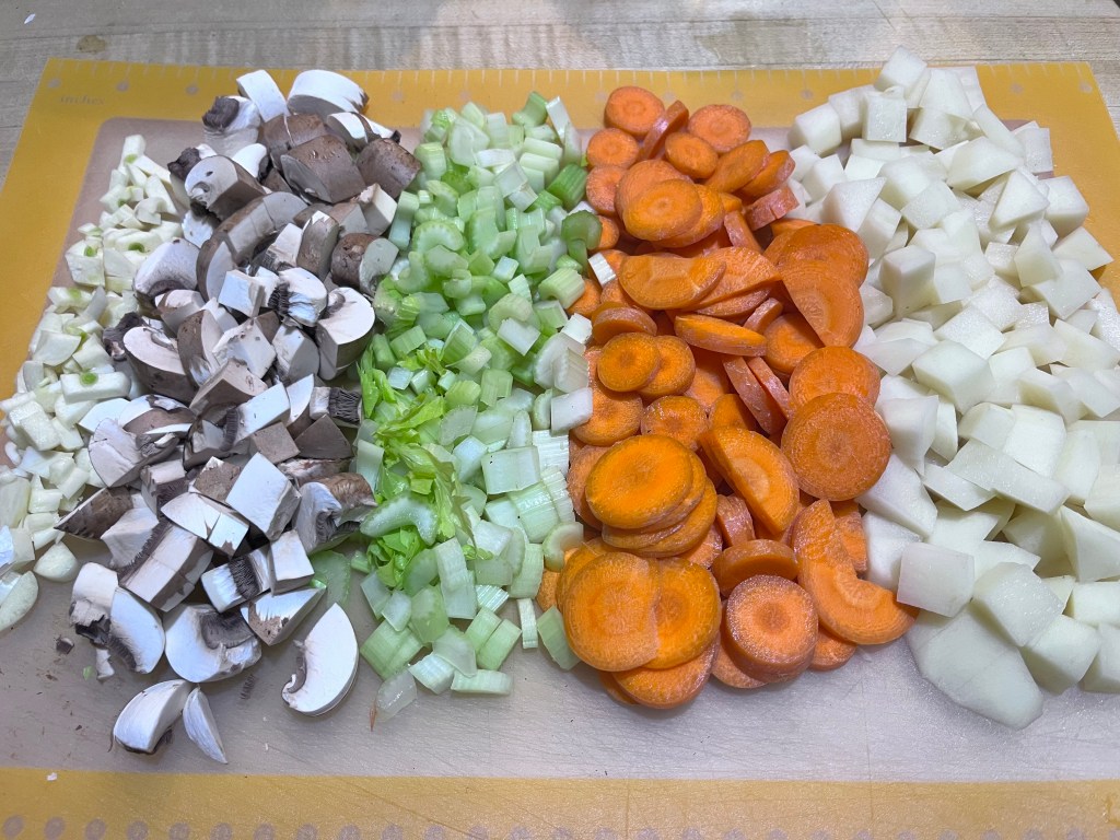 Add a tablespoon of vegetable oil to a large Dutch oven and sweat the veggies for a couple minutes. Season with salt and pepper and add the thyme.