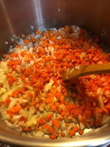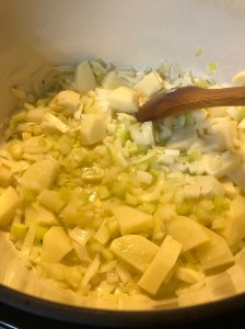 Add a tablespoon of vegetable oil to a large Dutch oven and sweat the veggies for a couple minutes. Season with salt and pepper and add the thyme.