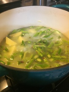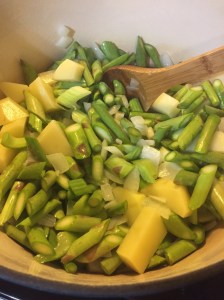 Your kettle will be very full and it may be difficult to stir. Bring the pot to a boil and reduce heat to a simmer. Keep the cover on your pot. Simmer for one hour and forty minutes. Occasionally remove the lid and stir the cabbage. The cabbage cooks down making it easier to stir.