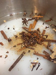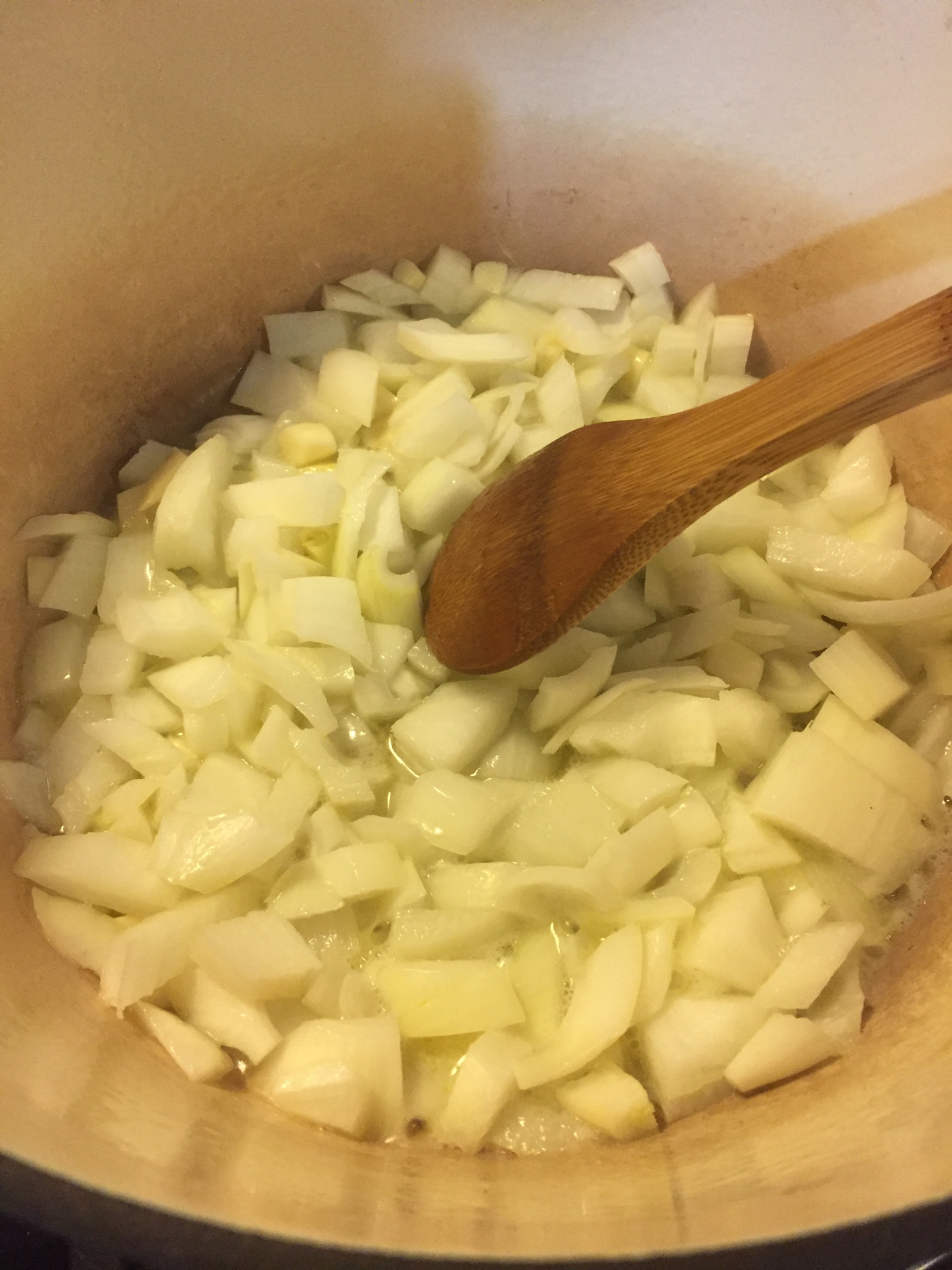 Put your cabbage, onion, and apple in the Dutch oven. Add the sugar, butter, cider vinegar, water, and spices. Everything but the cornstarch goes into the pot.