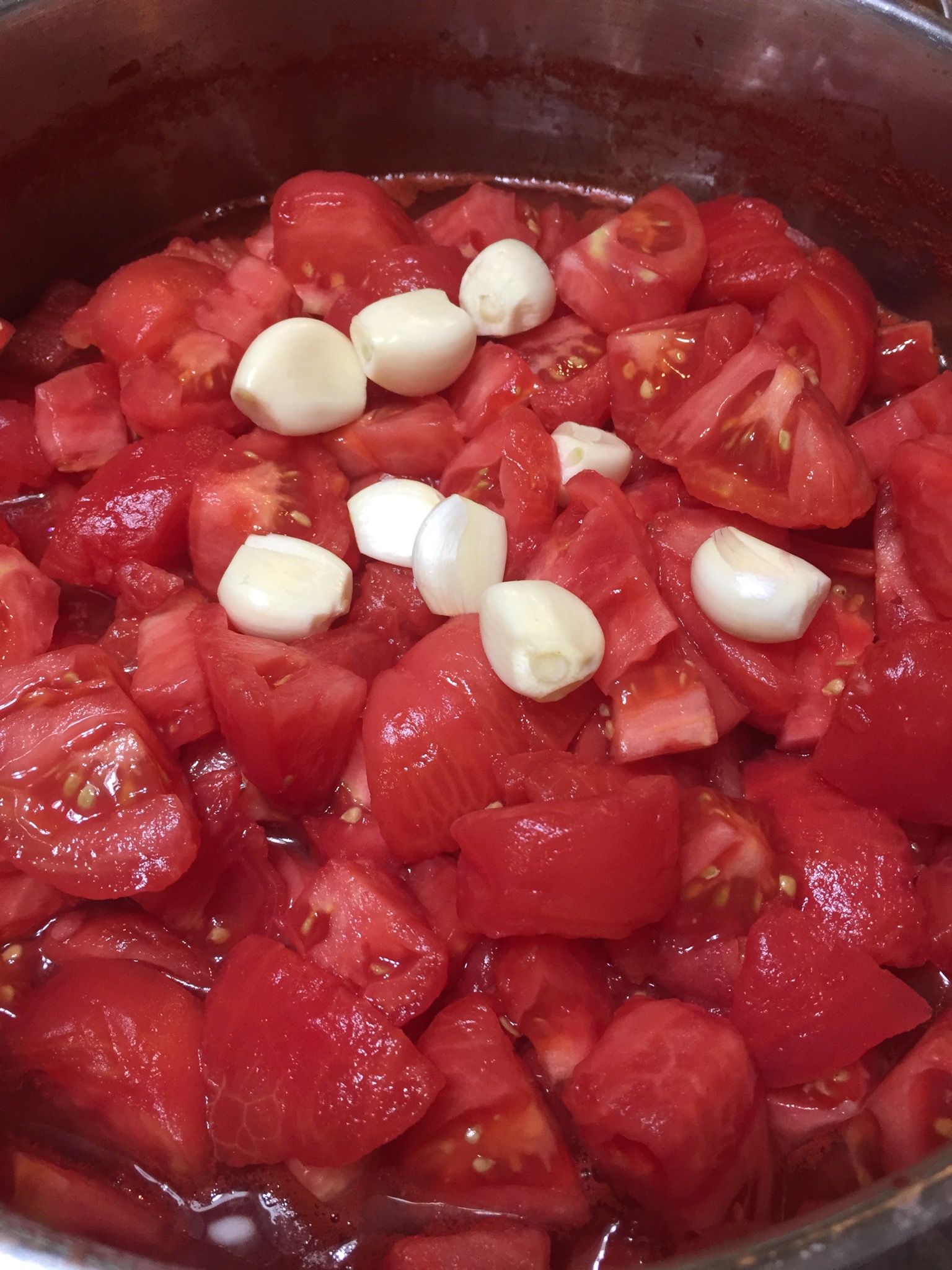 Stir in the tomatoes and cook until thickened and reduced by half.