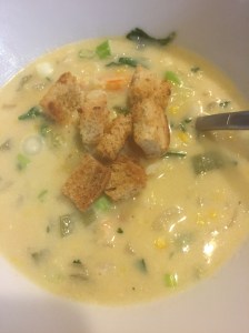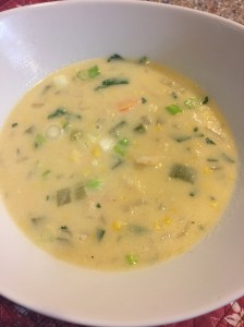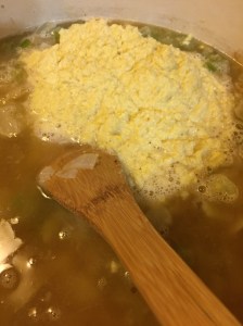 Bring the soup back to a simmer. If you prefer the soup to be creamer remove a few cups to a heat proof bowl and, using an immersion blender, purée. Add the purée back to the pot. A friend told me she uses her mother’s recipe which calls for the addition of 1 can of creamed corn. Potato flakes can also be used to thicken the soup.