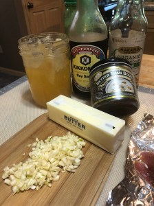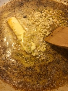 Turn the heat down to medium and add the butter and garlic to the pan drippings. Cook until the butter melts and the garlic becomes fragrant, about 5 minutes, scrapping up the browned bits in the skillet.
