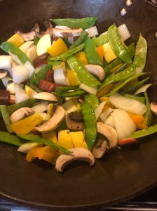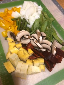 While the pork is roasting, get your vegetables ready to stir-fry. Any combination of vegetables work fine. I had pea pods, onion, sweet peppers, summer squash, green beans and mushrooms.