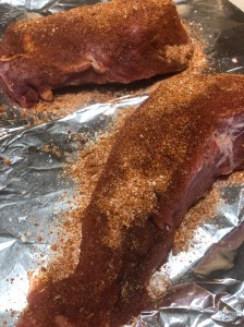 Using a paper towel, pat the tenderloin dry. Combine the rub ingredients and sprinkle on both sides of the pork.