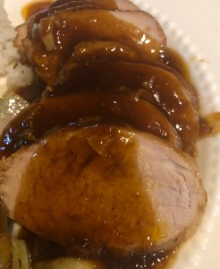 Cover and roast for 10 minutes. Uncover and continue roasting until the internal temperature reaches 145. Total roast time for me was 20 minutes. Remove from the oven. Set the tenderloins aside and cover with tin foil. Mix the cornstarch with a little water and add to the sauce. Cook over medium heat until the sauce thickens. Return the pork to the sauce. Ladle the sauce over the tenderloins.