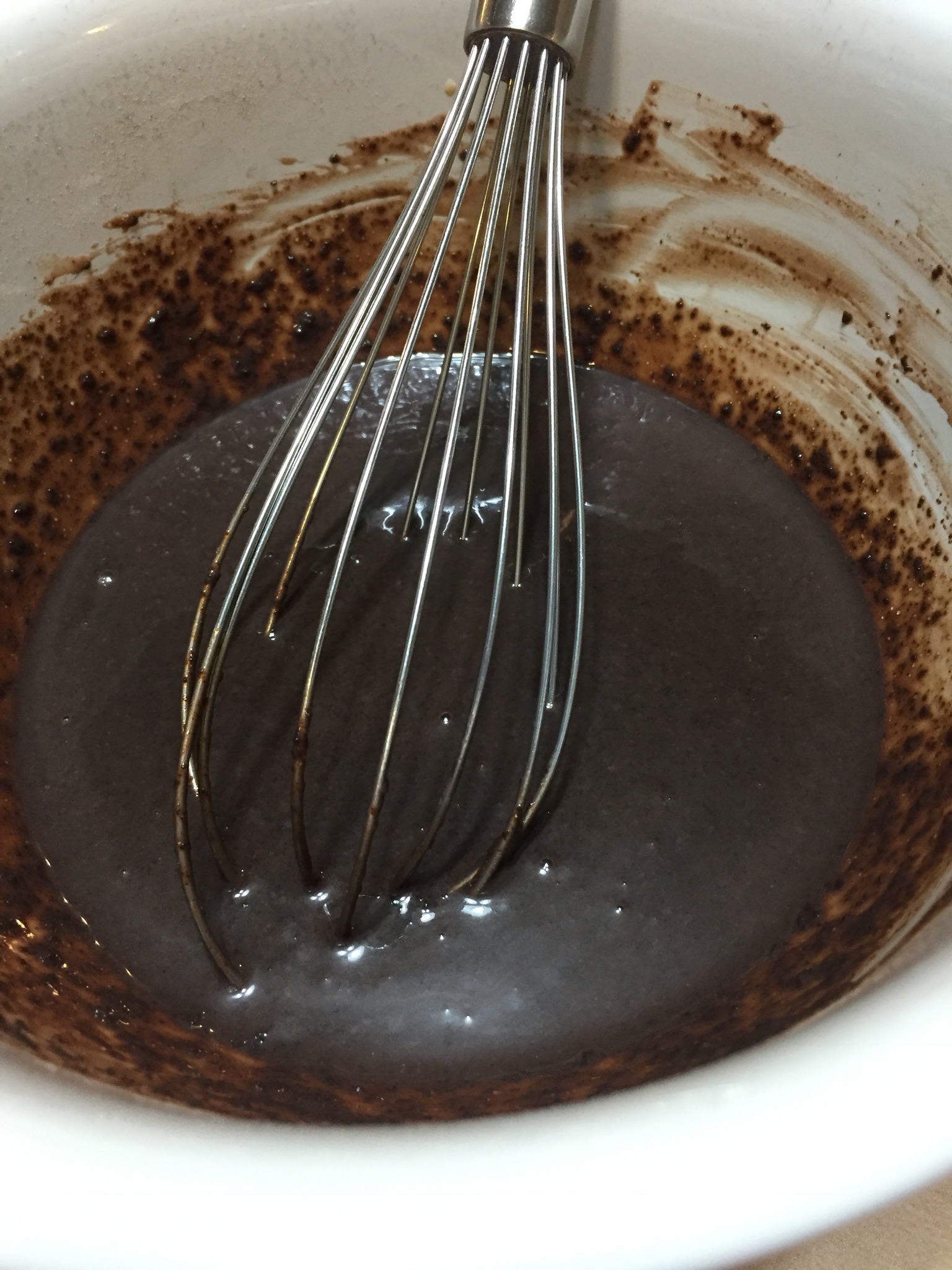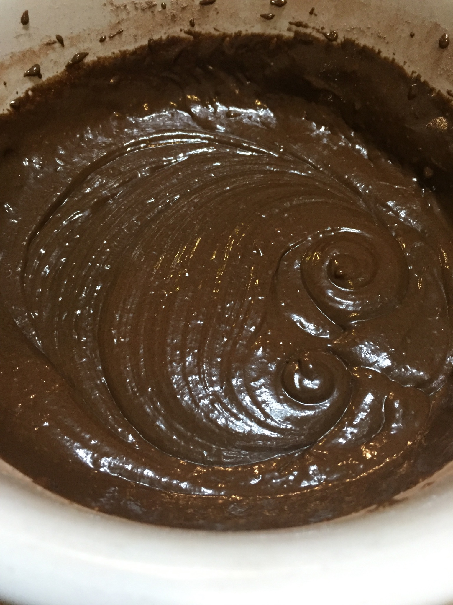 Preheat your oven to 350° and grease three 8” round cake pans and line bottoms with parchment paper. In a high-speed blender whiz together the cocoa powder and boiling water. Allow the mixture to sit for 5 minutes to bloom the cocoa and allow the mixture to cool a bit.